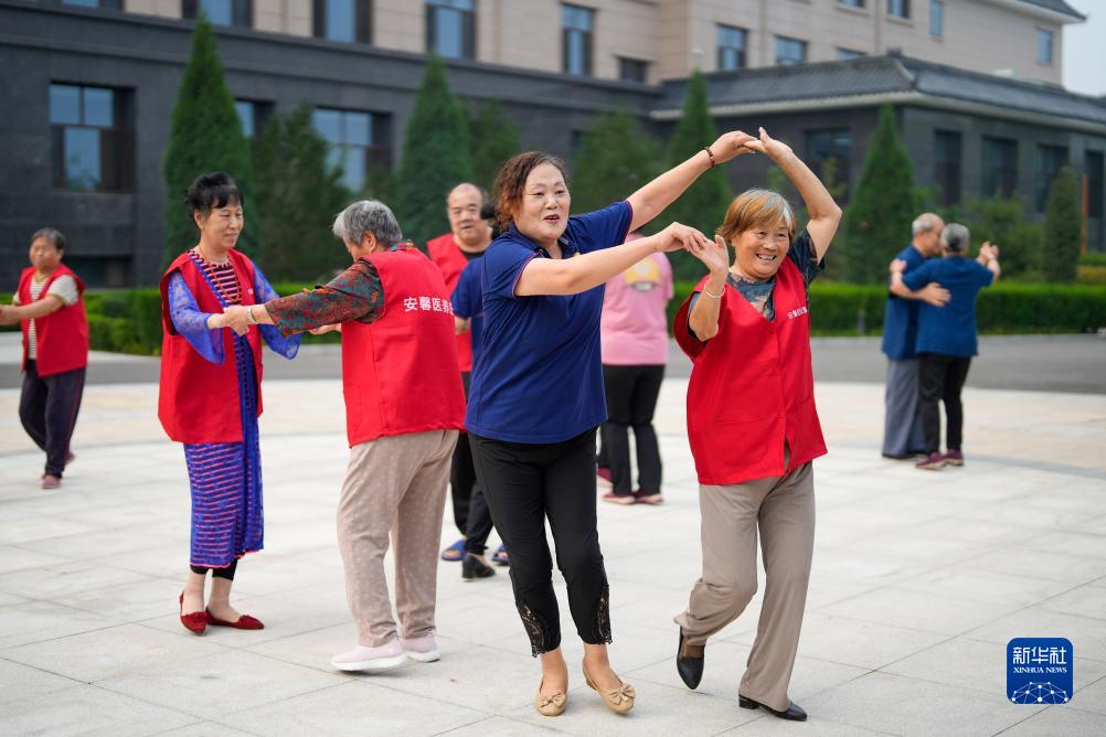 9月12日,河北省唐山市古冶區一家養老機構的老人們在院子里運動(dòng)。
