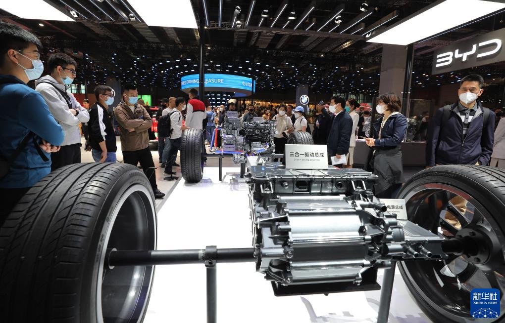 參觀(guān)者在第二十屆上海車(chē)展比亞迪汽車(chē)展臺展出的DM-P插混動(dòng)力單元模型展品前駐足觀(guān)看(2023年4月24日攝)。