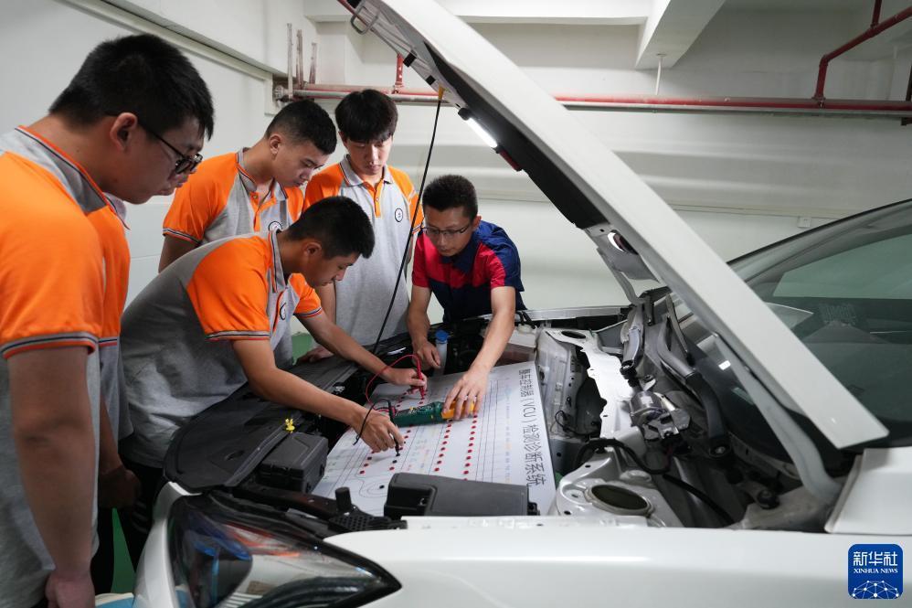 9月12日,在重慶市北碚區職業(yè)教育中心新能源汽修實(shí)訓室,教師(右一)在給學(xué)生講解新能源汽車(chē)維修知識。