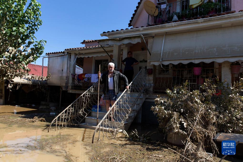 9月12日,希臘中部卡爾季察地區的一處村莊,人們站在遭遇洪水的房屋前。