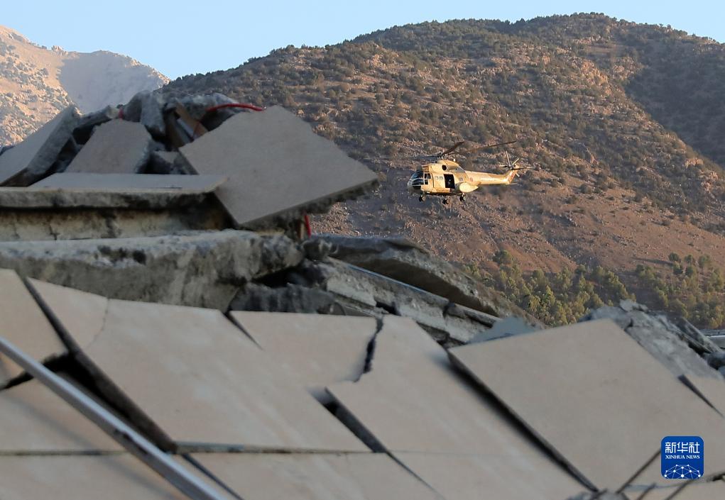 9月12日,救援直升機在震中區域的摩洛哥豪茲省塔拉特恩雅庫布村附近飛行。
