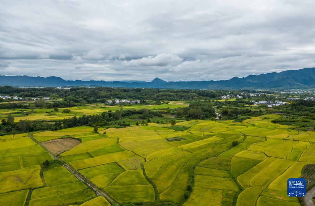 這是9月13日拍攝的黟縣碧陽(yáng)鎮附近的水稻田和徽派民居(無(wú)人機照片)。