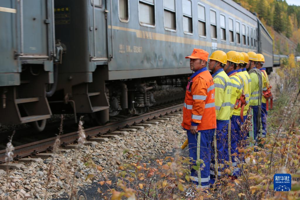 9月13日,中國鐵路哈爾濱局集團有限公司加格達奇工務(wù)段的鐵路工人在大興安嶺地區嫩林線(xiàn)等待火車(chē)通過(guò)。