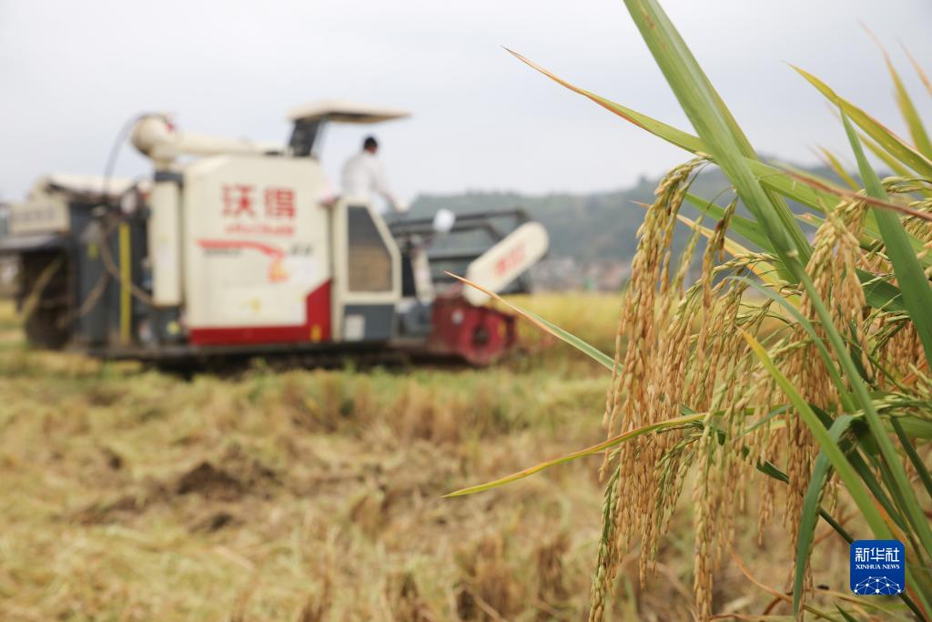 9月14日,村民在貴州省黔東南苗族侗族自治州施秉縣城關(guān)鎮上翁哨村駕駛收割機收割水稻。