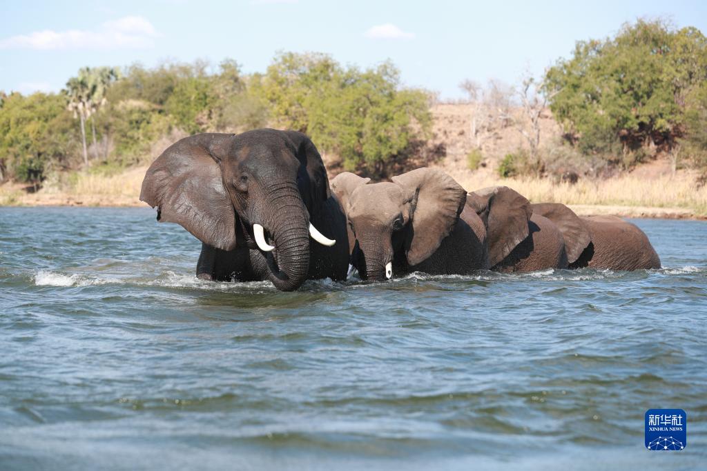 幾頭大象穿過(guò)贊比亞境內的贊比西河(2019年9月8日攝)。