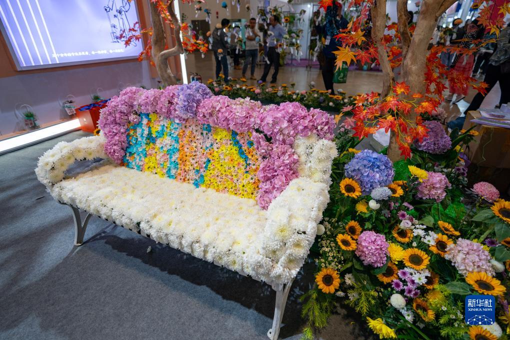 這是9月15日在第二十一屆中國昆明國際花卉展上拍攝的一張由鮮花裝飾的長(cháng)椅。