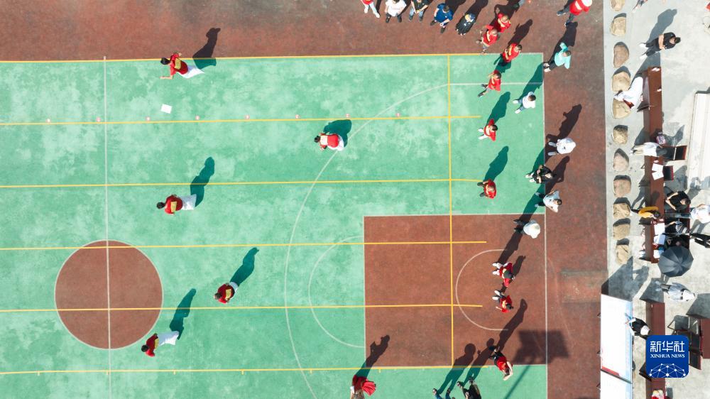 9月15日,在秀山縣洪安鎮農民趣味運動(dòng)會(huì )現場(chǎng),村民參加“袋鼠跳”比賽(無(wú)人機照片)。
