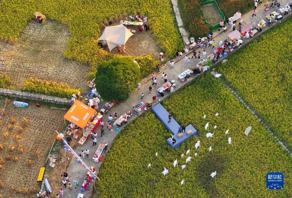當日,湖南省張家界市武陵源區黃龍洞景區舉辦“田園市集慶秋收”活動(dòng)。金黃的稻田旁,游人可欣賞民俗文化節目,還可品嘗特色小吃、購買(mǎi)當地特色農產(chǎn)品和手工藝品,感受豐收的喜悅。