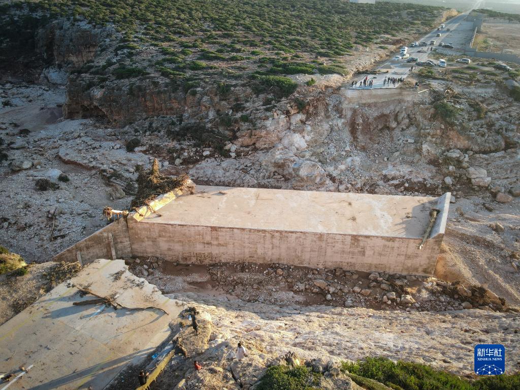 這是9月15日在利比亞?wèn)|部德?tīng)柤{附近拍攝的被毀的橋梁(航拍照片)。