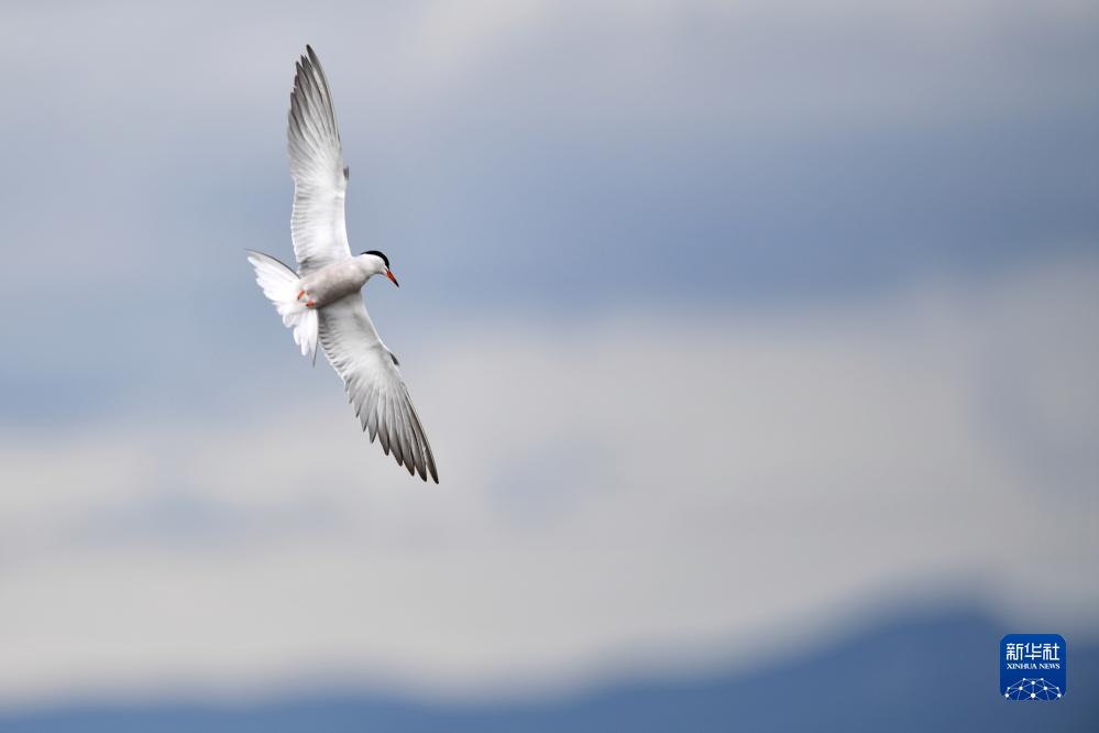 一只燕鷗在甘肅尕海則岔國家級自然保護區的尕海濕地上飛翔(7月7日攝)。