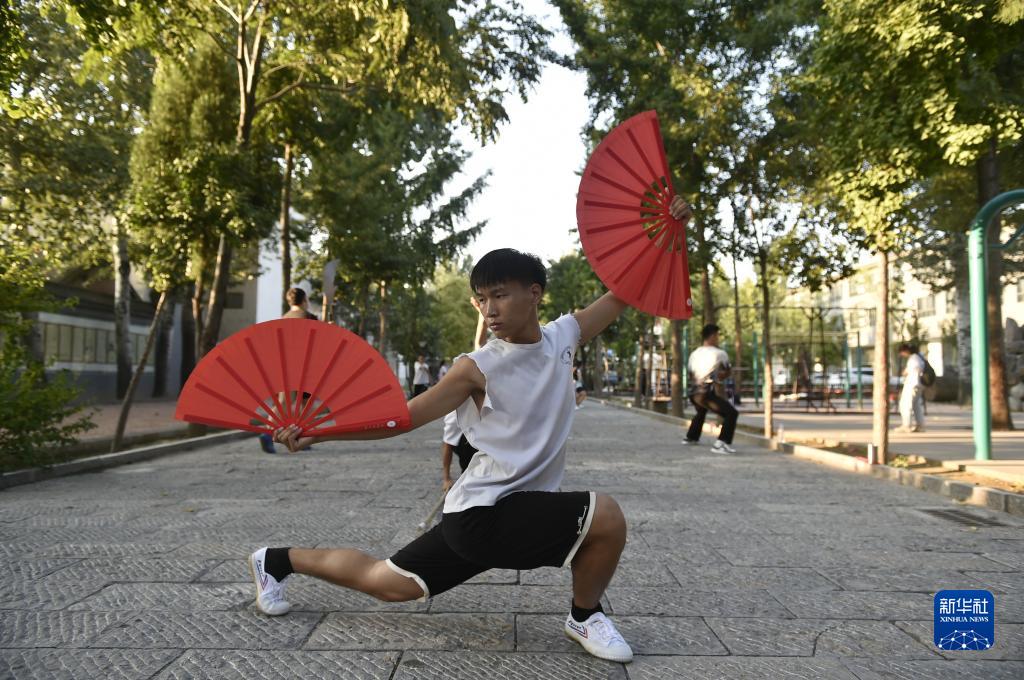 9月14日,河南溫縣陳家溝一家武術(shù)學(xué)校的學(xué)員在練習太極扇。