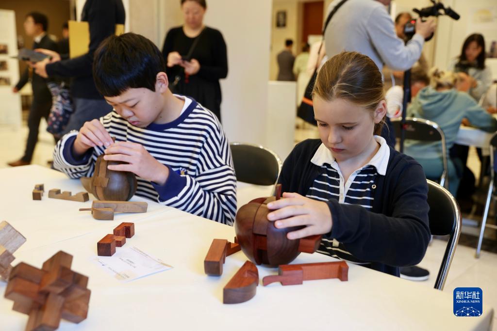 9月16日,小朋友在比利時(shí)布魯塞爾的中國使館開(kāi)放日活動(dòng)上體驗榫卯技藝。
