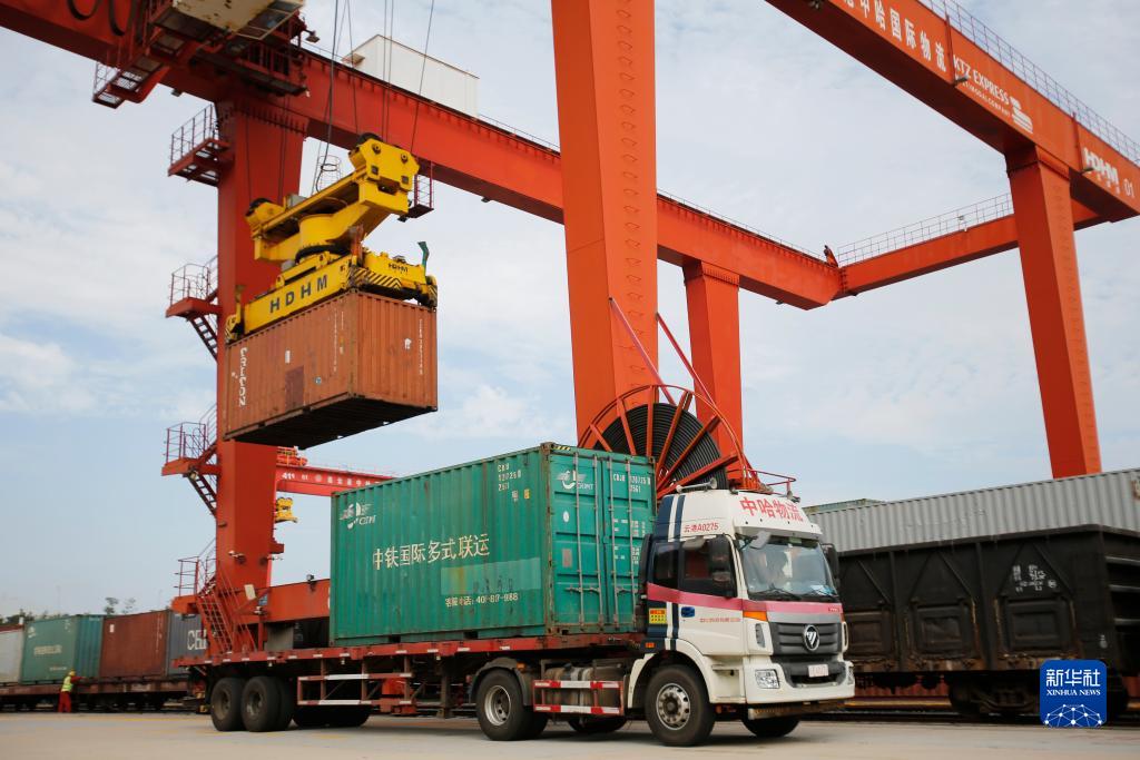 9月16日,在位于江蘇連云港的中哈連云港物流合作基地,龍門(mén)吊在進(jìn)行卸車(chē)作業(yè)。