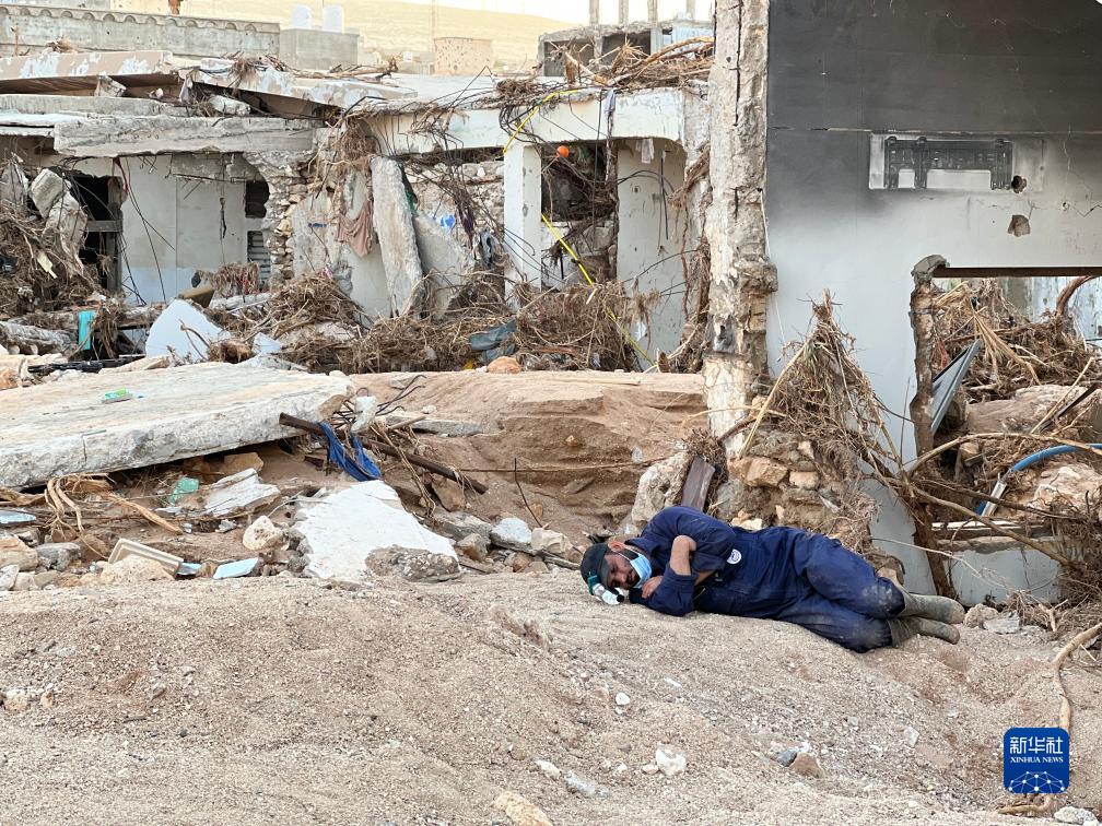 9月17日,一名救援人員躺在利比亞德?tīng)柤{的建筑物廢墟上休息。