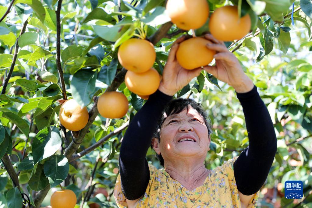 9月17日,在山東省萊西市南墅鎮,農民在采摘秋月梨。