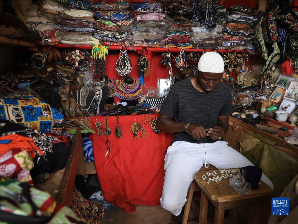 9月16日,在喀麥隆首都雅溫得手工藝品市場(chǎng),一名手工藝人制作手工藝品。