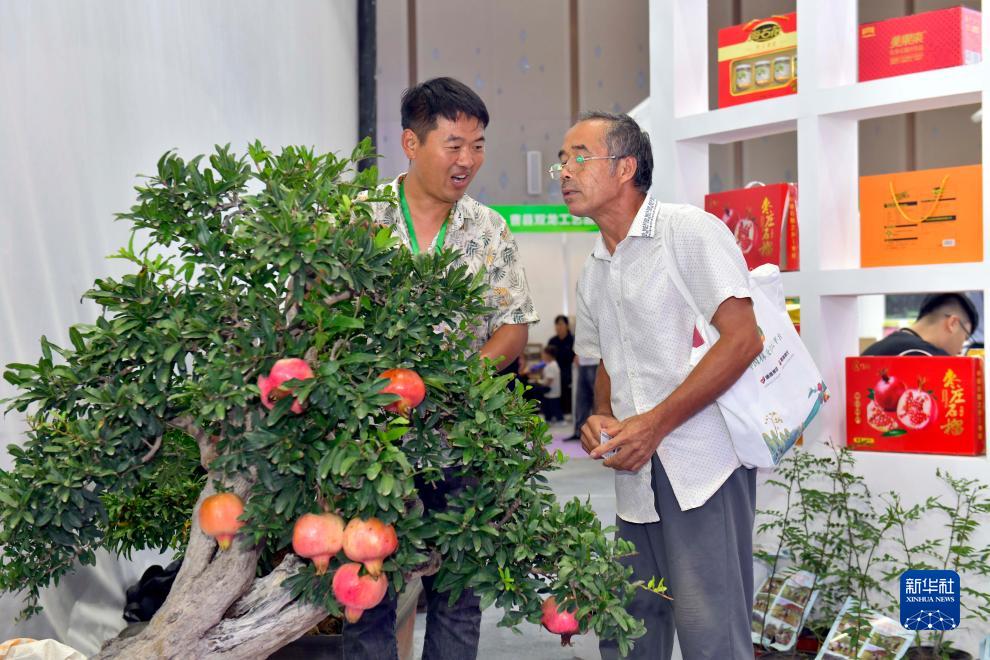 9月19日,在菏澤國際會(huì )展中心,工作人員(左)在推介石榴產(chǎn)品。