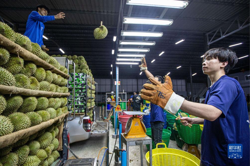 9月18日,在泰國春蓬府一家榴蓮工廠(chǎng)內,工作人員在分揀剛采摘的榴蓮。