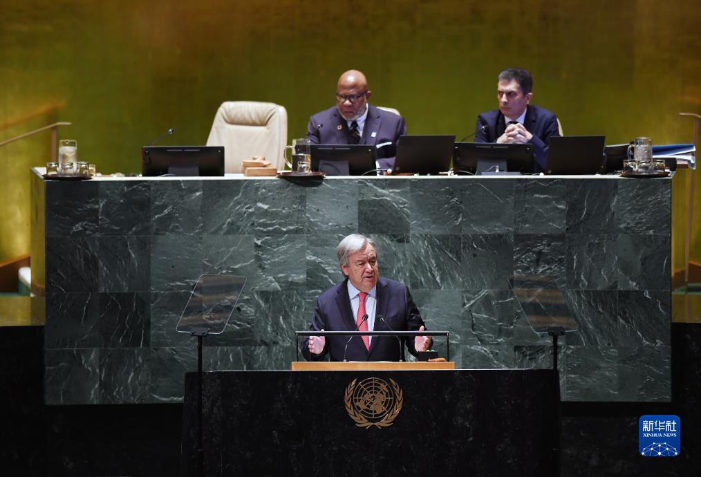 9月19日,在位于紐約的聯(lián)合國總部,聯(lián)合國秘書(shū)長(cháng)古特雷斯(前)在第78屆聯(lián)合國大會(huì )一般性辯論開(kāi)幕式上講話(huà)。