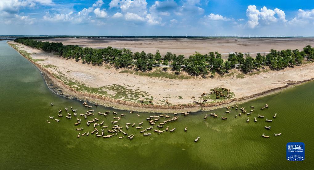 麋鹿生活在江蘇大豐麋鹿國家級自然保護區(8月21日攝,無(wú)人機照片)。