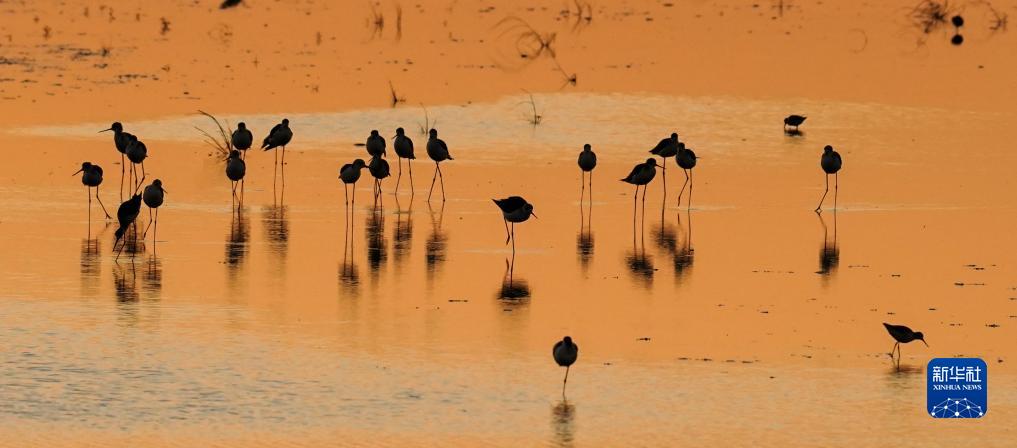 群鳥(niǎo)棲息在夕陽(yáng)下的東臺條子泥濕地(8月31日攝)。