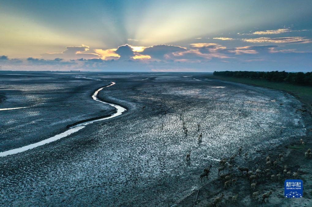 大豐麋鹿國家級自然保護區野外生活的麋鹿種群(8月21日攝,無(wú)人機照片)。