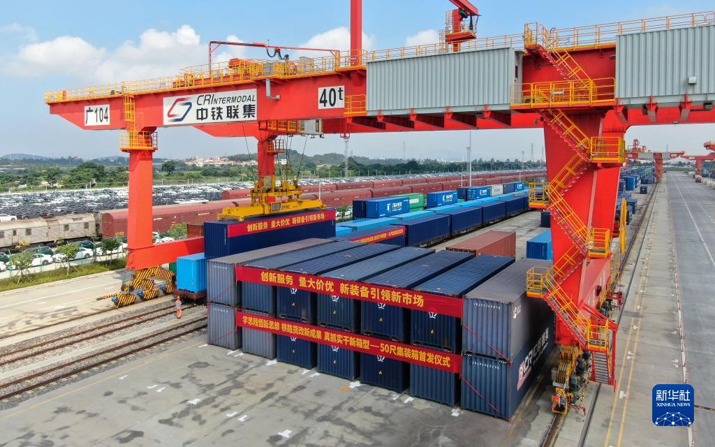 9月20日,在廣州國際港,起重機將50英尺集裝箱吊運到貨運列車(chē)上(無(wú)人機照片)。