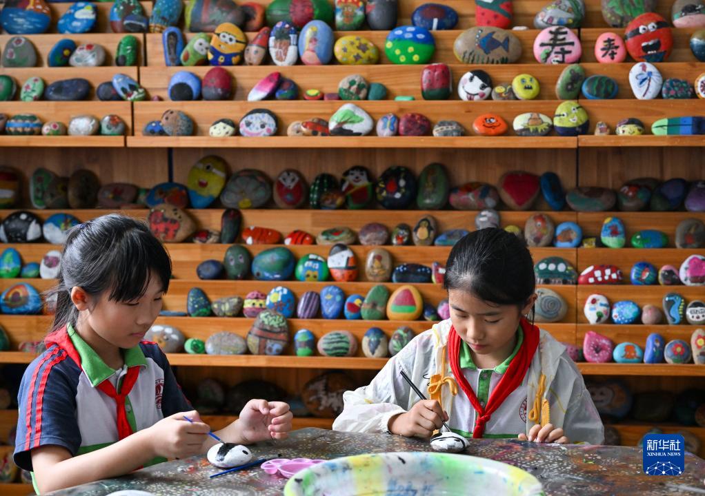 9月20日,重慶市忠縣烏楊小學(xué)卵石畫(huà)社團的學(xué)生在學(xué)習、體驗卵石畫(huà)創(chuàng )作。