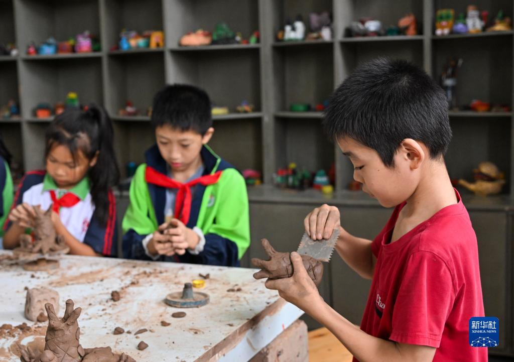 9月20日,重慶市忠縣烏楊小學(xué)泥塑社團的學(xué)生在學(xué)習、體驗泥塑。