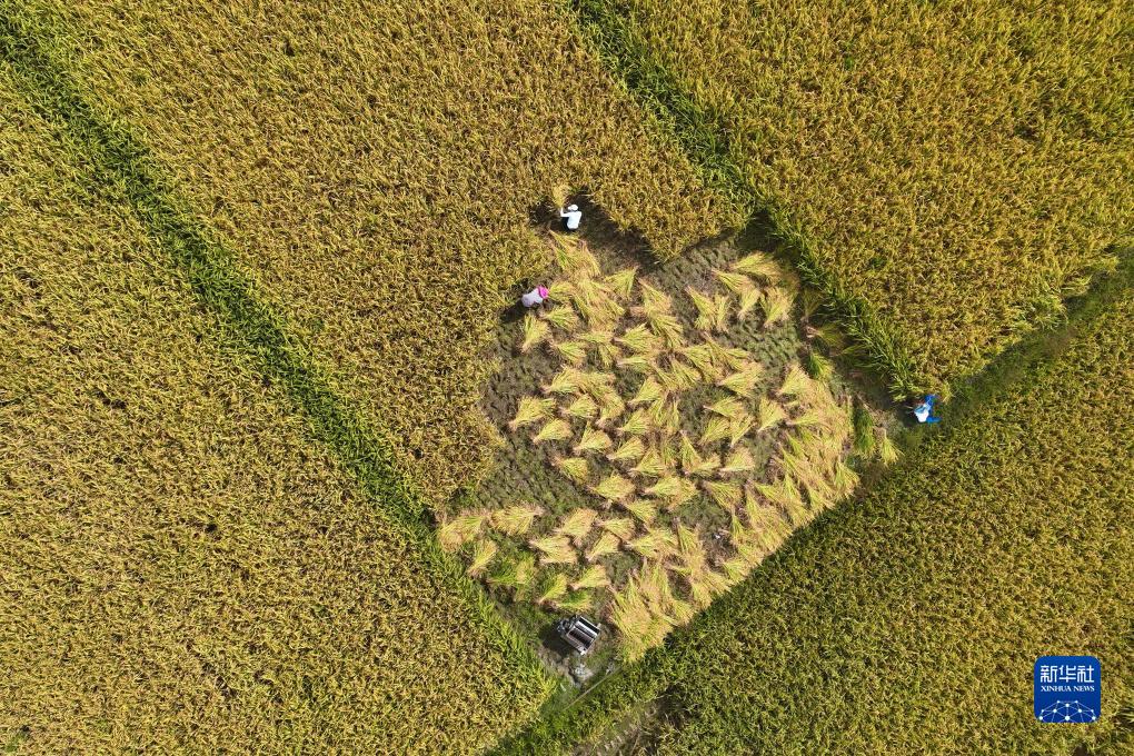 9月19日,重慶市黔江區馬喇鎮杉樹(shù)村村民在收獲貢米稻谷(無(wú)人機照片)。