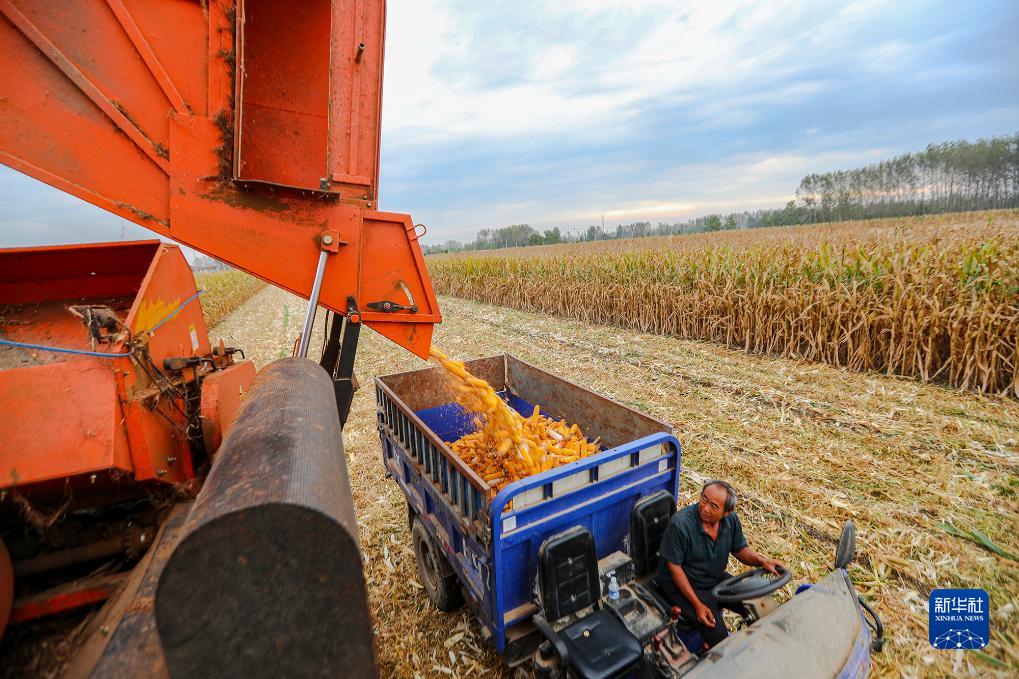 9月18日,農民在河南省商丘市睢陽(yáng)區李口鎮順北村駕駛收割機搶收玉米。