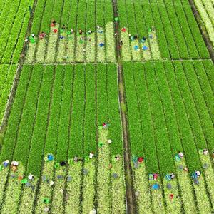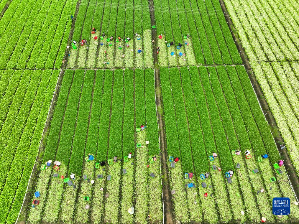 9月23日,在湖南省常寧市勝橋鎮合泉村蔬菜種植基地,村民在采收蔬菜(無(wú)人機照片)。