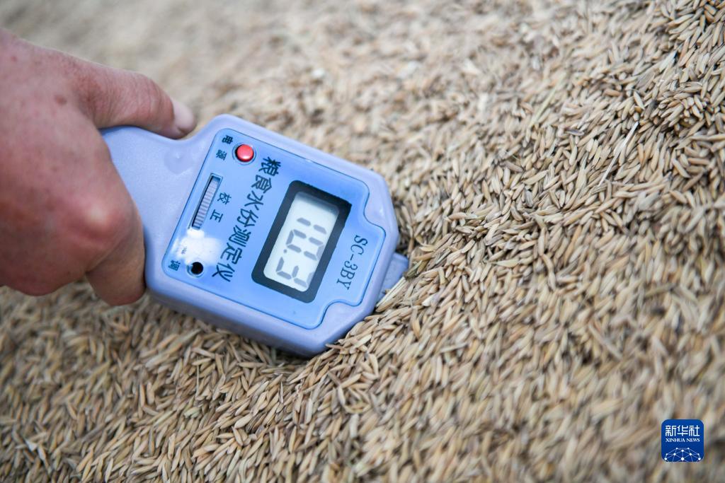 9月24日,在湖南省永州市道縣梅花鎮一家糧食收購企業(yè),工作人員在測定稻谷水份。