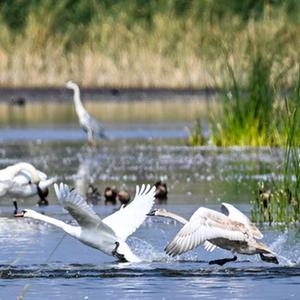 烏梁素海,意為“紅柳湖”,位于黃河“幾字彎”頂部,是黃河流域最大的湖泊濕地。近年來(lái),隨著(zhù)烏梁素海生態(tài)治理力度不斷加大,生態(tài)成果也不斷顯現。各類(lèi)候鳥(niǎo)在這里安了家,本來(lái)前往西伯利亞的疣鼻天鵝也在烏梁素海產(chǎn)卵孵化生活,烏梁素海成為我國最大的疣鼻天鵝繁殖基地。近日,在烏梁素海湖面上,成年疣鼻天鵝帶領(lǐng)幼鳥(niǎo)練習飛翔,準備為過(guò)冬前的長(cháng)途遷徙做準備。