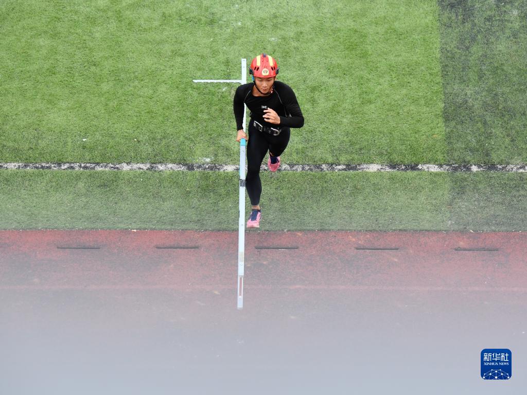 9月26日,參賽選手在進(jìn)行攀登掛鉤梯比賽。