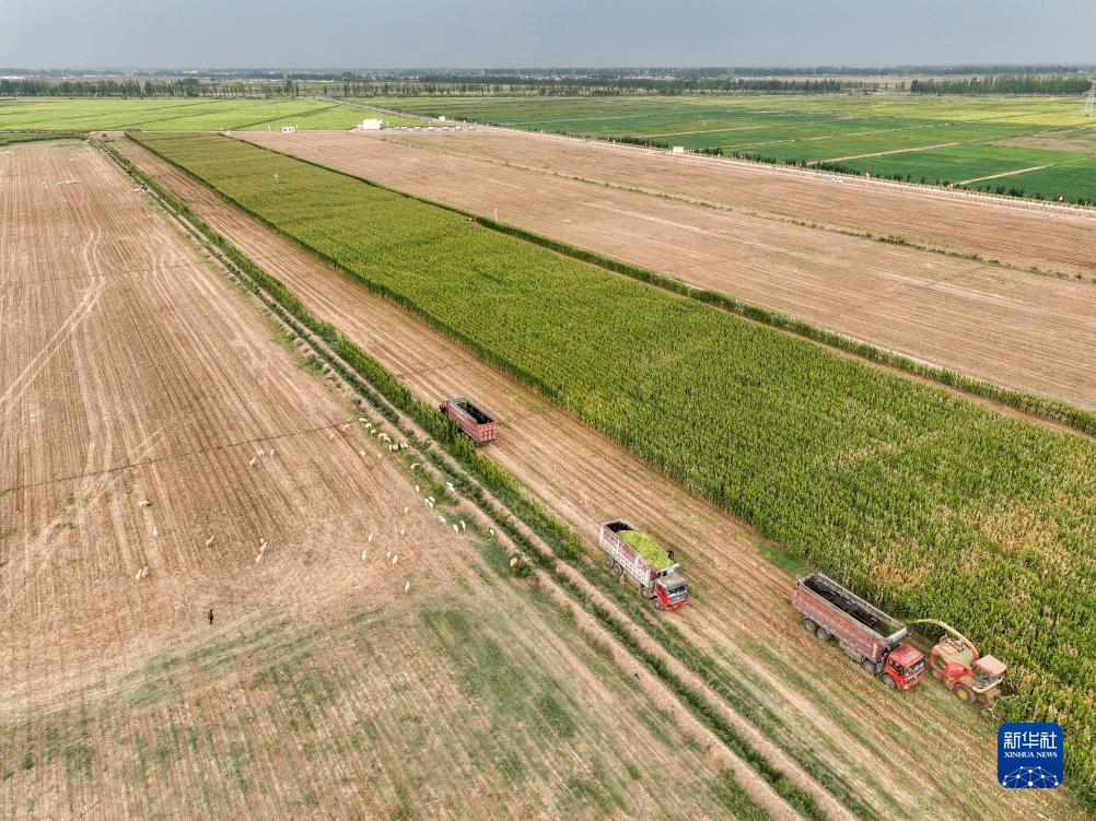 在內蒙古巴彥淖爾市臨河區城關(guān)鎮,收割機在收割青儲玉米(無(wú)人機照片,9月14日攝)。