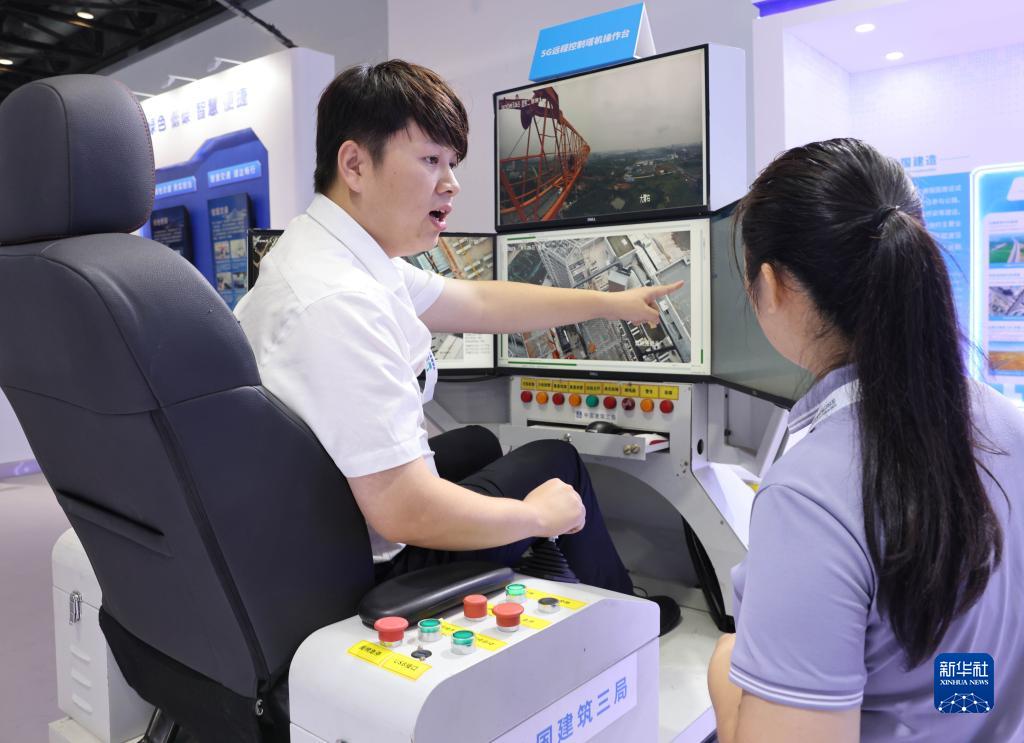 9月26日,中建三局工作人員介紹5G遠程控制塔機操作臺。