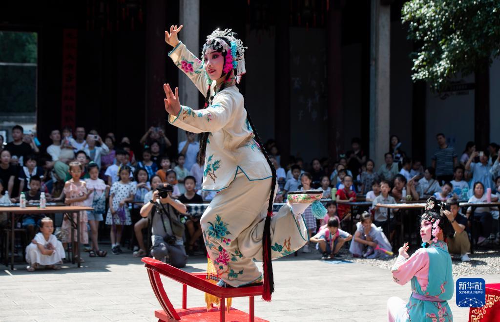 9月29日,在浙江省金華市非遺館,浙江婺劇藝術(shù)研究院演員在表演婺劇折子戲《掛畫(huà)》。