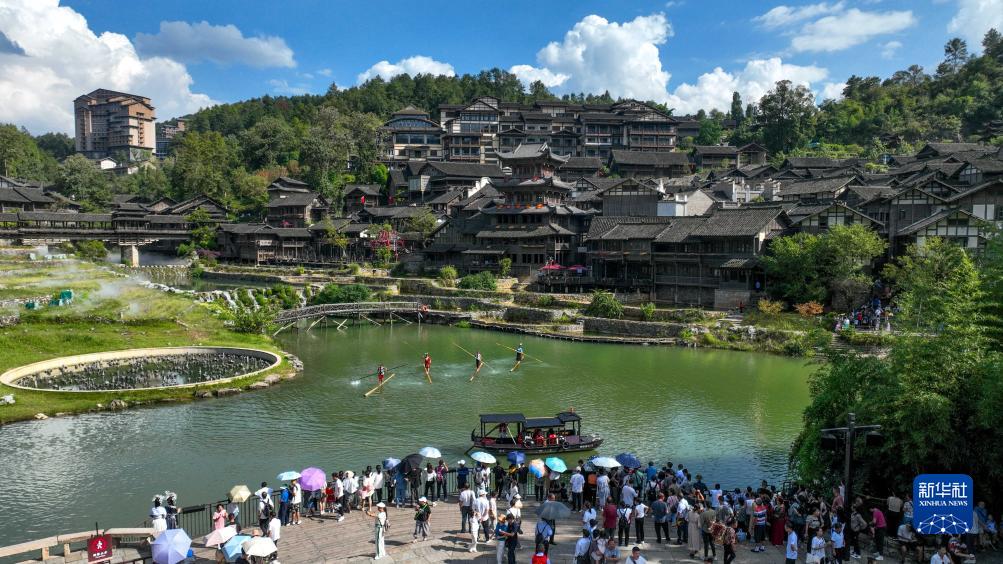 9月29日,游客在貴州省遵義市播州區烏江古寨景區觀(guān)看獨竹漂表演(無(wú)人機照片)。