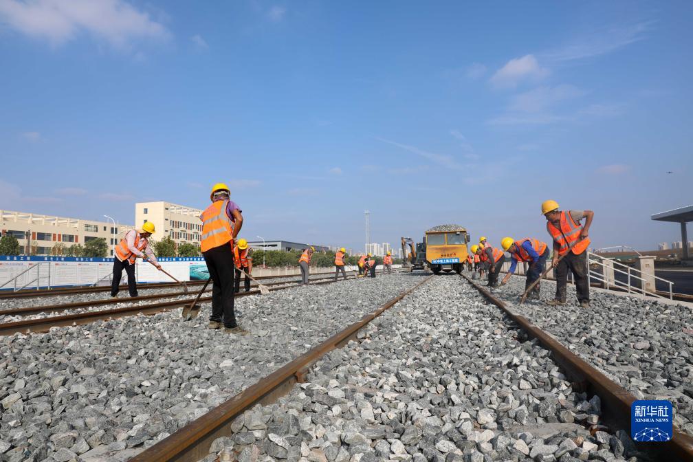 9月30日,中鐵上海工程局的工人在新建合肥派河港鐵路物流基地項目施工現場(chǎng)作業(yè)。