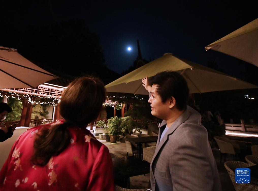 9月29日,人們在德國漢堡的豫園內欣賞中秋滿(mǎn)月。