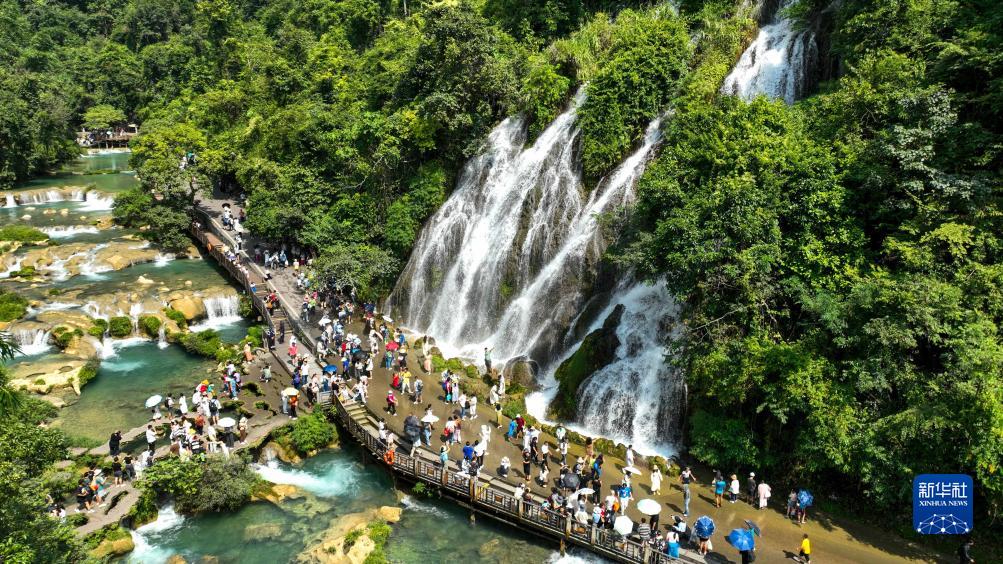 10月1日,游客在貴州省黔南布依族苗族自治州荔波縣小七孔景區觀(guān)光游玩(無(wú)人機照片)。