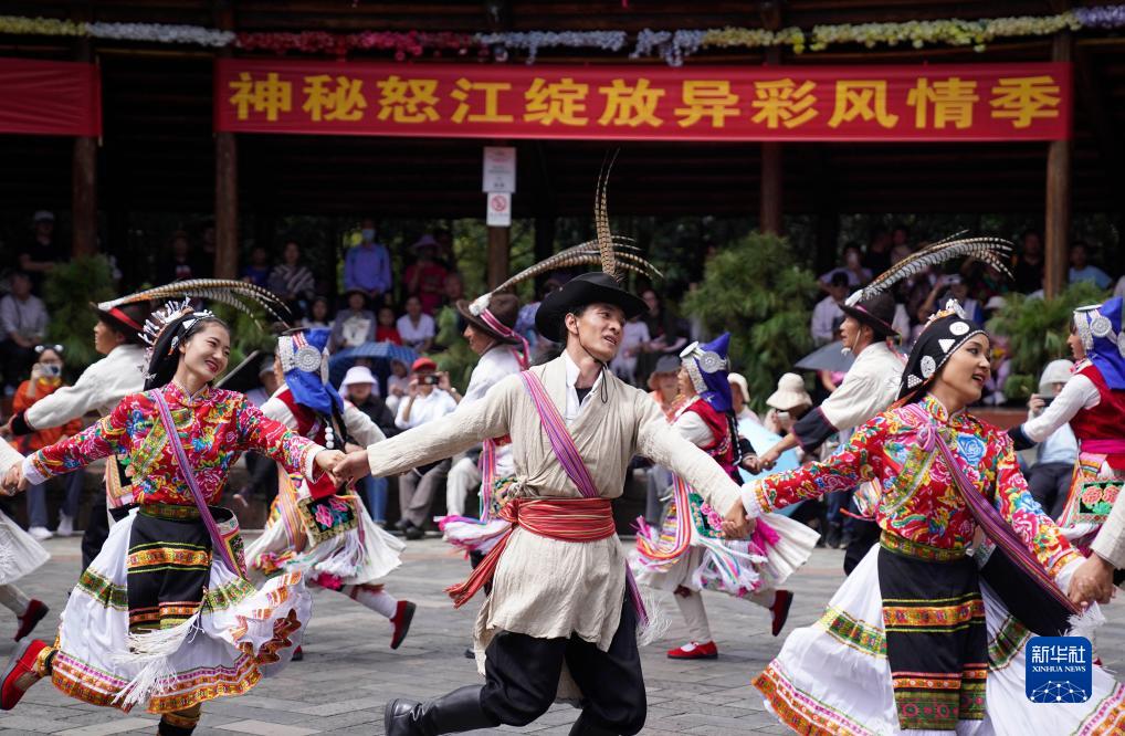 10月1日,游客和演員在云南省昆明市的云南民族村一起歡度節日。