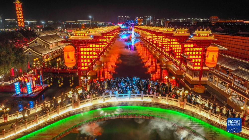 10月1日,游客在唐山市豐南區河頭老街賞燈游玩(無(wú)人機照片)。