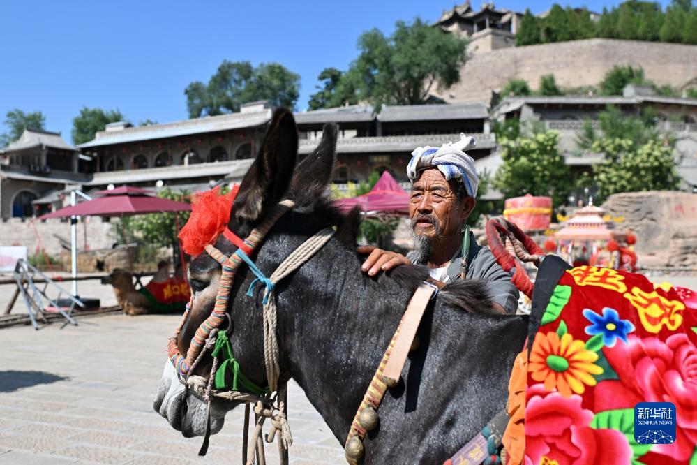 在山西磧口古鎮,村民李永林給毛驢梳毛(8月2日攝)。李永林在村里的16畝地上種小麥、玉米和土豆,農閑時(shí)把他的毛驢打扮一新,在景區供游客騎乘。