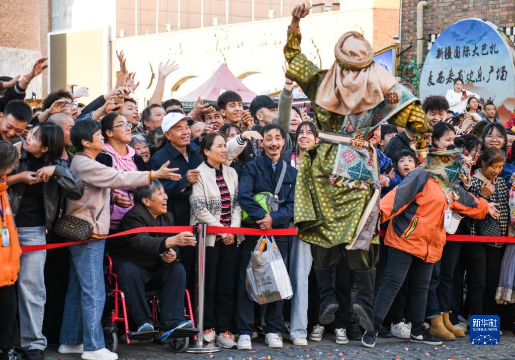 10月2日,在烏魯木齊大巴扎步行街,演員與觀(guān)眾互動(dòng)。