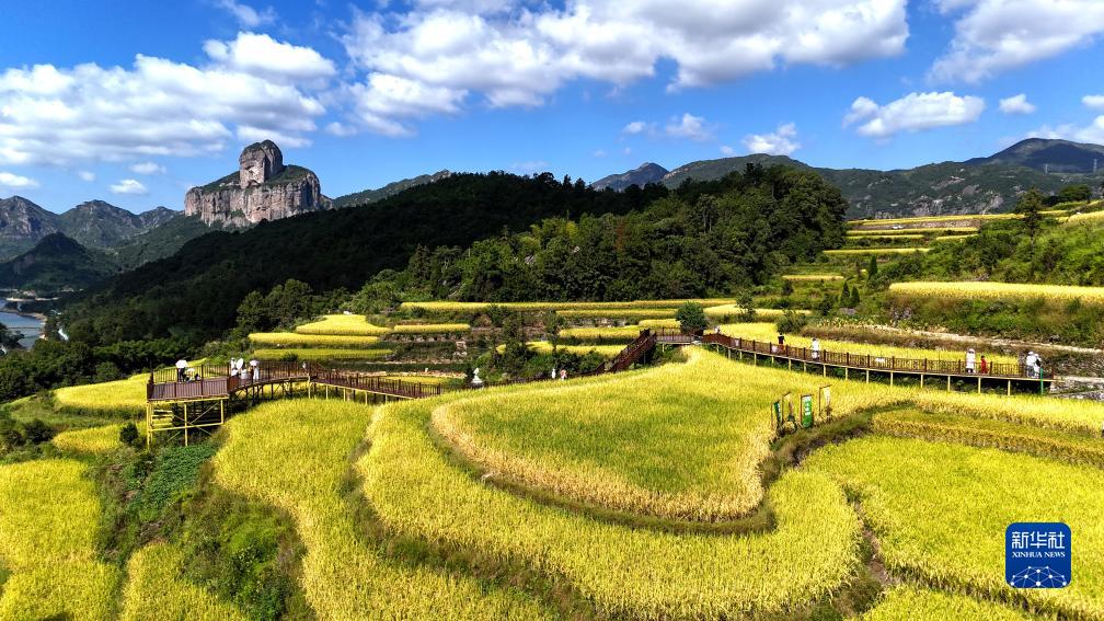 10月3日,游客在浙江省樂(lè )清市白石街道中雁村梯田間觀(guān)光(無(wú)人機照片)。