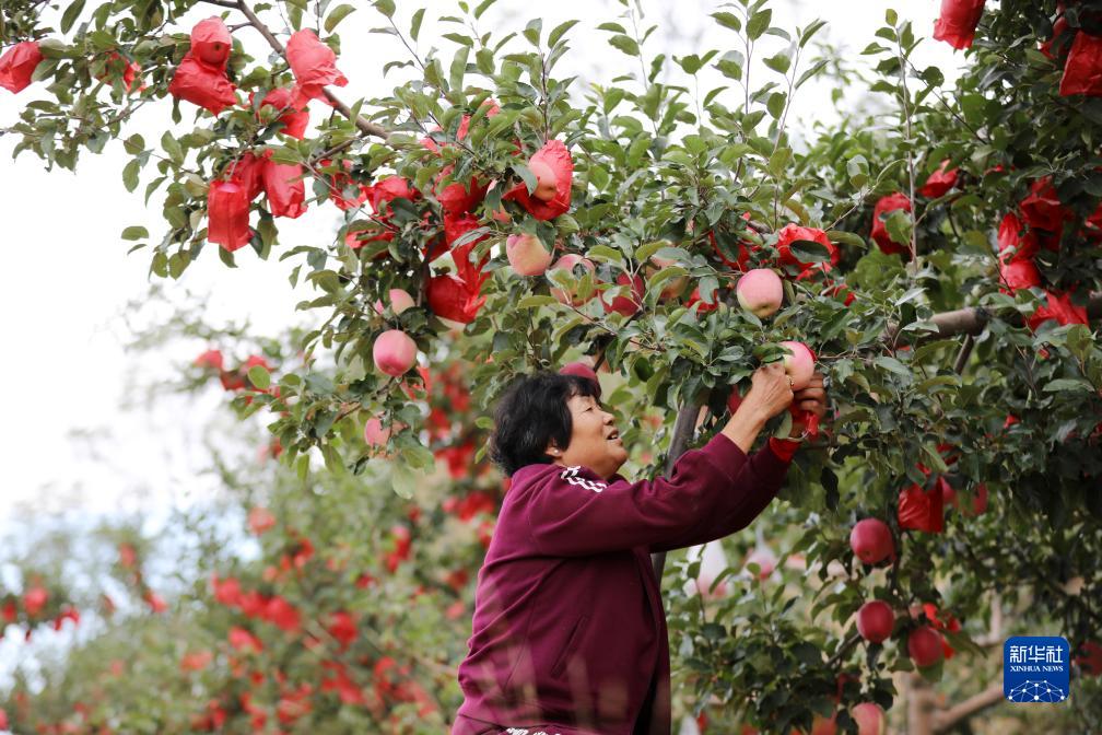 10月2日,在甘肅省靜寧縣賈河鄉侯山村下山社果園,農戶(hù)在忙著(zhù)解袋。近日,甘肅省平?jīng)鍪徐o寧縣100萬(wàn)畝蘋(píng)果陸續上市。