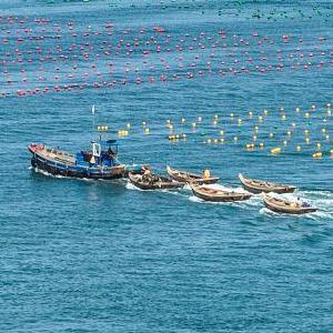 10月11日,在榮成市愛(ài)倫灣海洋牧場(chǎng)生態(tài)養殖區,漁民駕駛漁船、舢板出海作業(yè)(無(wú)人機照片)。