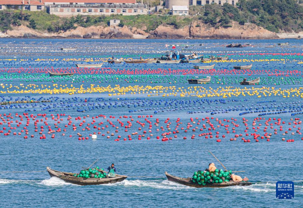 金秋時(shí)節,在山東省榮成市,各大海洋牧場(chǎng)海上養殖區一派繁忙景象,漁民駕駛漁船、舢板出海作業(yè),在碧海上“繪”出一幅幅秋日漁耕圖。